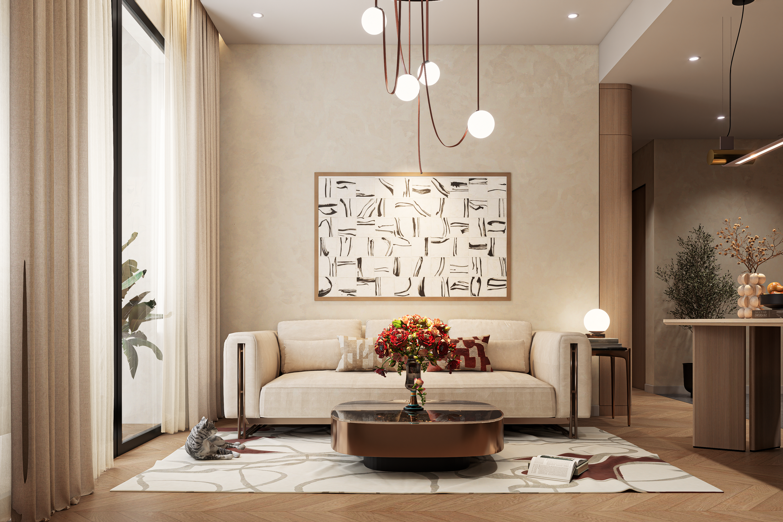 Nội thất "Leggy" & Đường cong tinh tế: Chiếc sofa nhung và bàn trà có thiết kế chân thanh mảnh giúp sàn nhà rộng mở, kết hợp cùng hệ đèn thả nghệ thuật tạo điểm nhấn thị giác cực kỳ đắt giá.